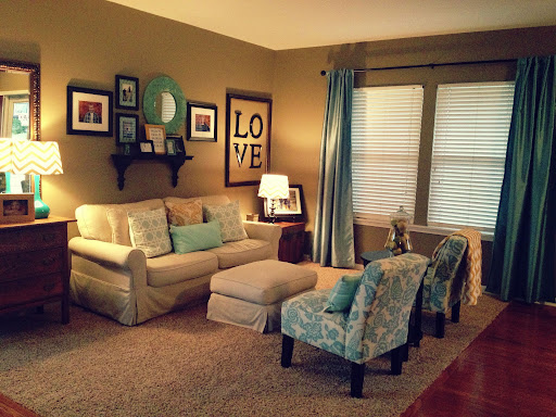 Finally My Sitting Room Facelift Is Done Teal Gold And Greige Neutrals Create A Serene Space To C Gold Living Room Brown Living Room Decor Brown Living Room